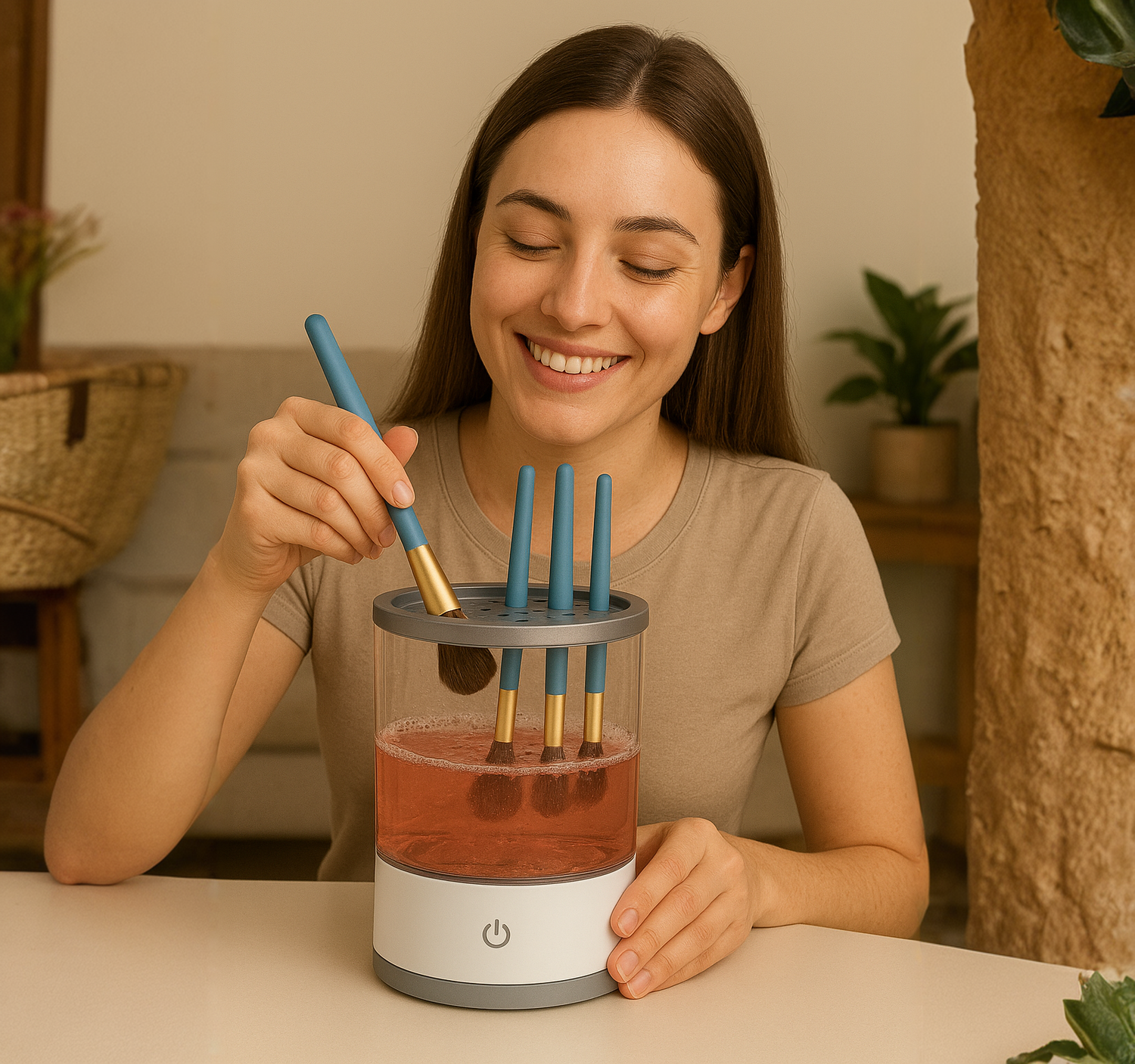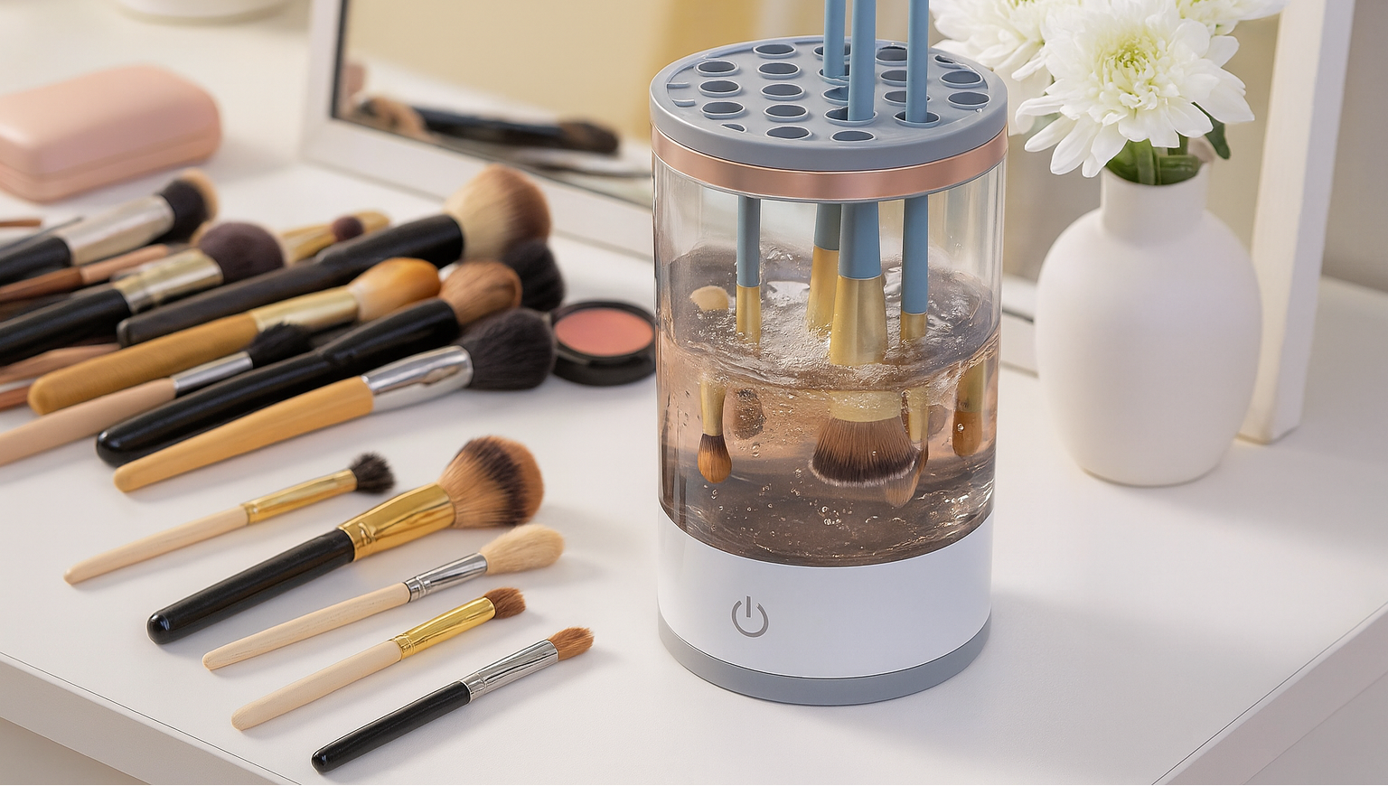 Brushella does the work for you in seconds: place your brushes, press a button and watch them spin until they are spotless.